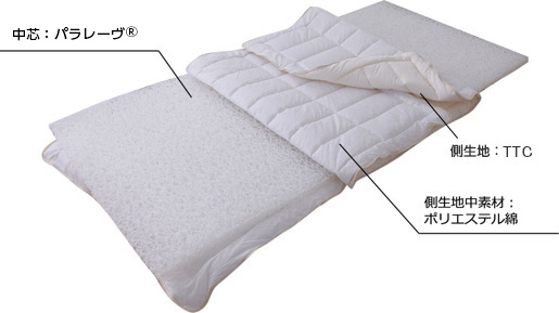 高機能の洗える中わた。 側地の中わたには、洗濯耐久性に優れた「東洋紡コンフォロフト®」と、抗菌防臭・防ダニ性のある帝人マイティトップ®2 ECOを採用。 洗濯後も優れた性能と風合いを保ちます。 また、パラレーヴ®をわたで包む様な仕様ととなりますので、パラレーヴ®の適度な弾力が有りながらも、ソフトな寝心地を実現しています。