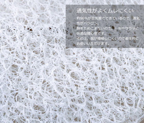 通気性が良く蒸れにくい。約96%が空気層で出来ているので、通気性が抜群。熱をため込まないので、1年中サラッと快適な寝心地です。その上、菌が増殖しにくいので衛生的にお使いいただけます。