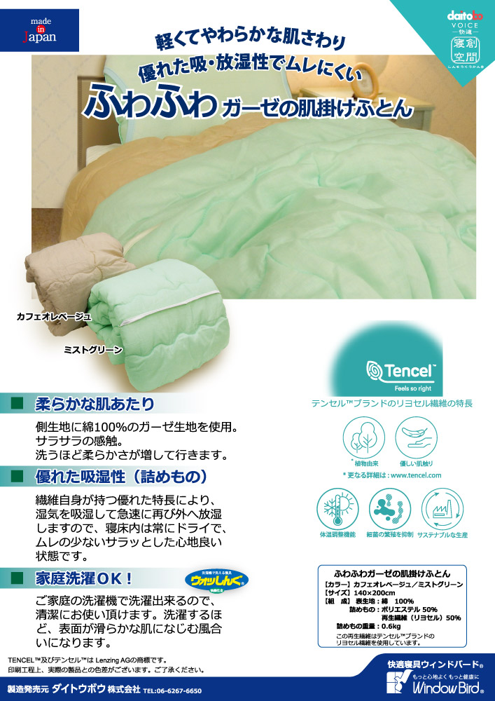 軽くて柔らかな肌触り。優れた吸湿・放湿性能でムレない。ふわふわガーゼの肌掛け布団のご紹介です。